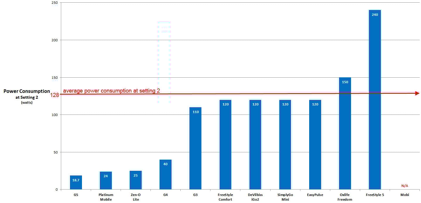 The G5 uses the least amount of power to operate at only 18.7 watts per hour. The Platinum Mobile and the Zen-O Lite follow closely behind, at 24 and 25 watts, respectively. The average watt usage for this group of O2 machines is 128 when operating at setting 2. Four of the concentrators operate at an average of 120 watts. Two devices consume power above the norm.